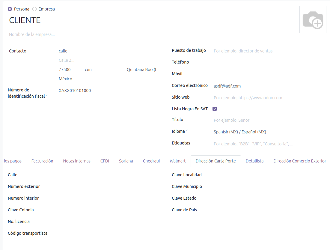 • Se debe configurar los contactos con la información "Dirección Carta Porte" de acuerdo a los catálogos del SAT.
