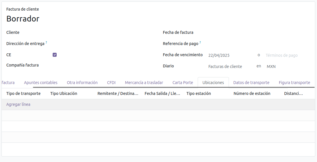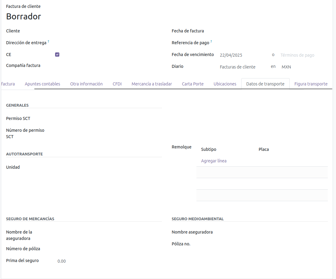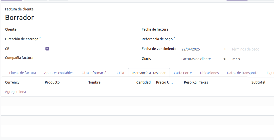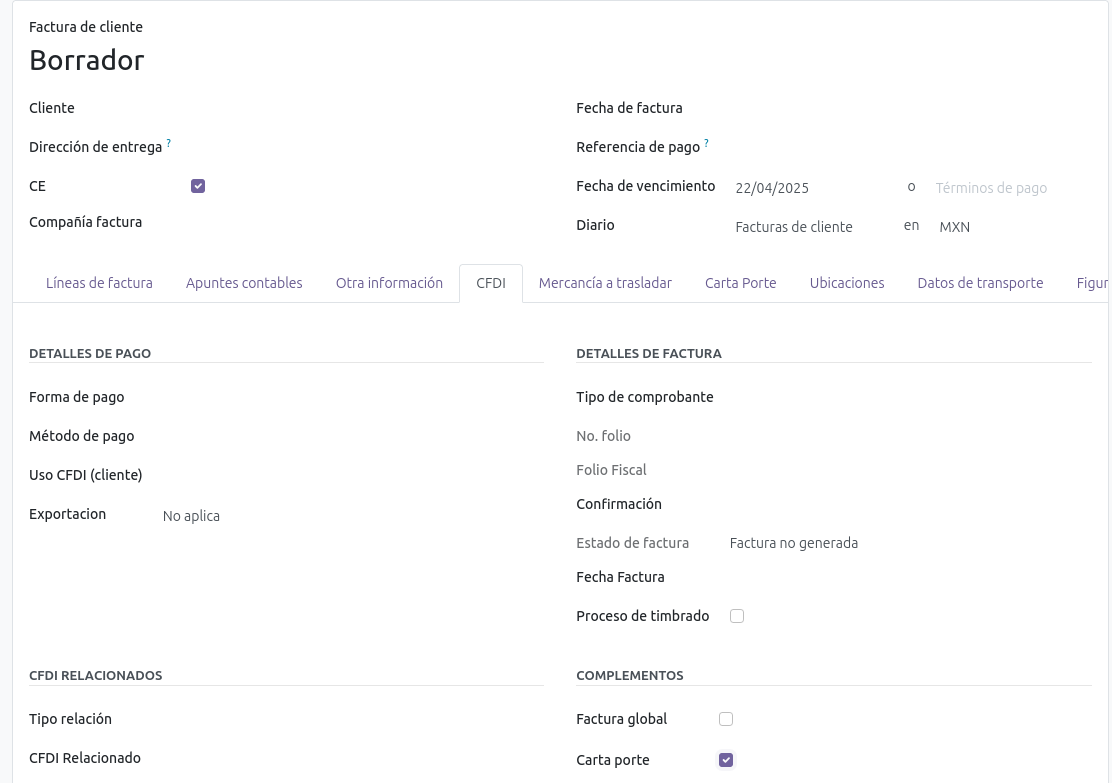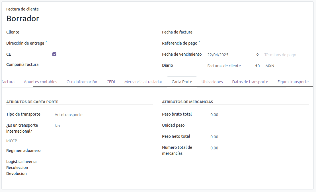 • En los documentos de factura se debe habilitar la opción de "Carta porte" para ver la información adicional a llenar.