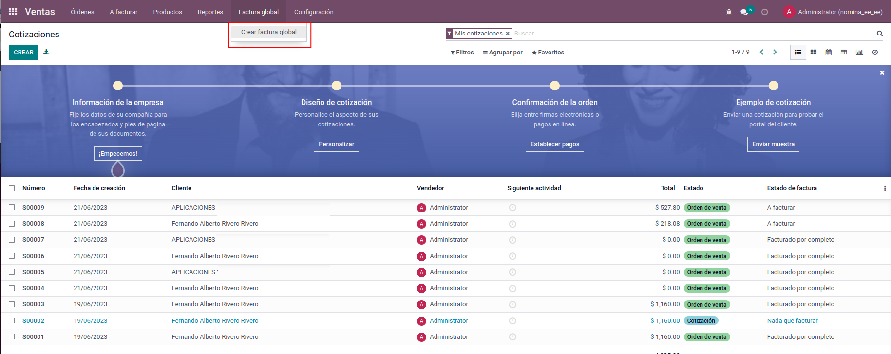 El módulo permite crear una sola factura a partir de múltiples pedidos de venta. La factura se puede crear de distintas maneras.