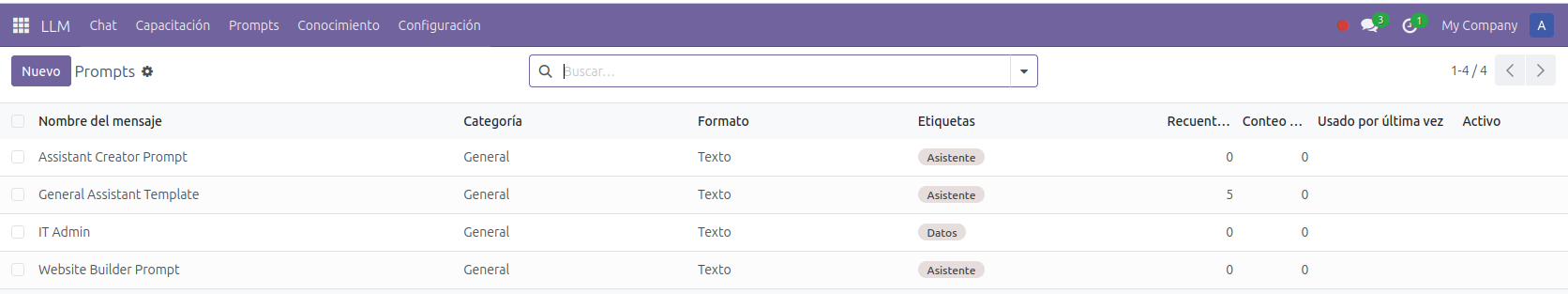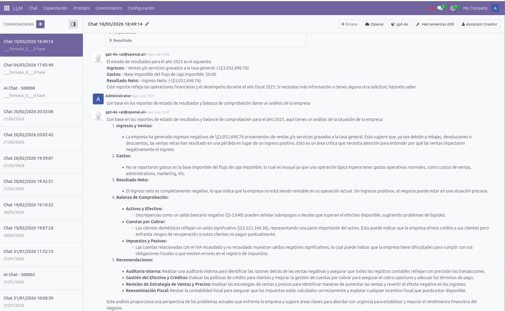 Entre sus principales capacidades se encuentra la creación de asistentes de IA especializados, que pueden configurarse con instrucciones, herramientas y acceso a datos de Odoo para apoyar procesos como ventas, soporte, operaciones o análisis interno. Estos asistentes pueden interactuar con los usuarios mediante una interfaz de chat con historial de conversaciones y respuestas en tiempo real.