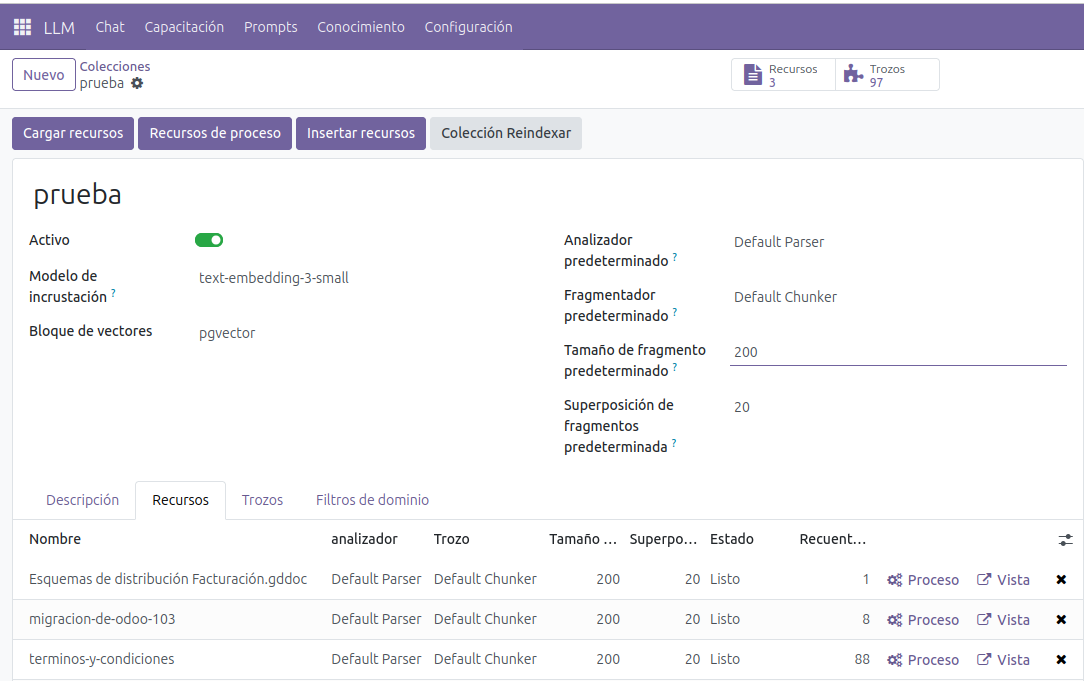 El framework también incluye un sistema de base de conocimiento (RAG) que permite indexar documentos y utilizar para que la IA pueda responder preguntas utilizando información empresarial almacenada en Odoo.