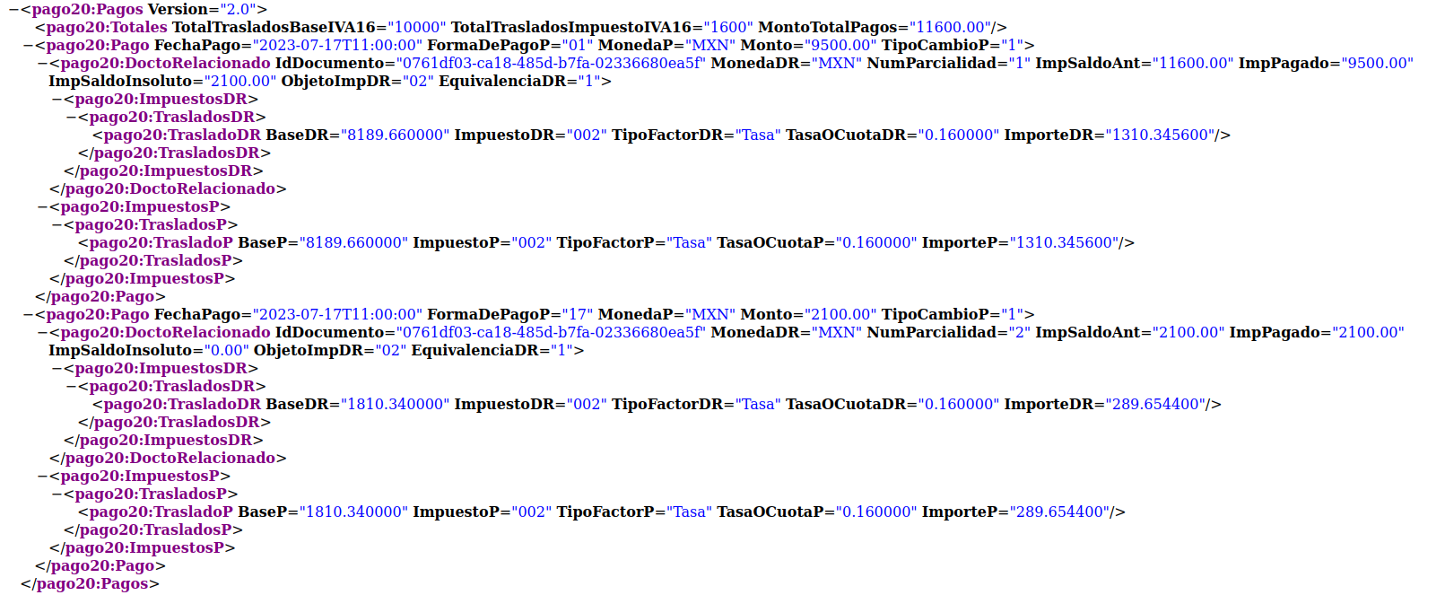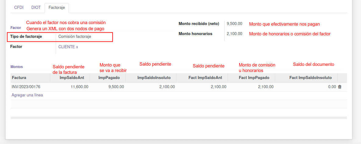 En el CFDI de pago aparece el receptor seleccionado y se crean dos nodos de pago, uno para el monto recibido y otro del monto por la comisión del factor.