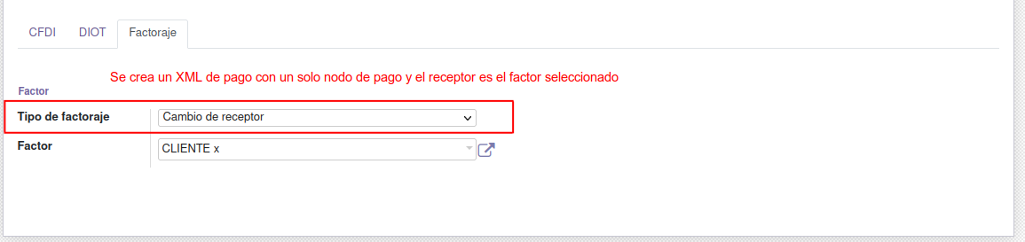 Se selecciona el tipo de factoraje: solo cambio de receptor o factoraje.